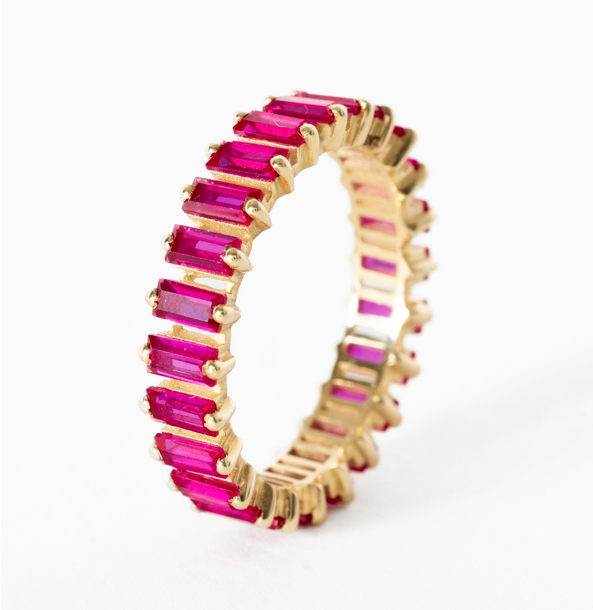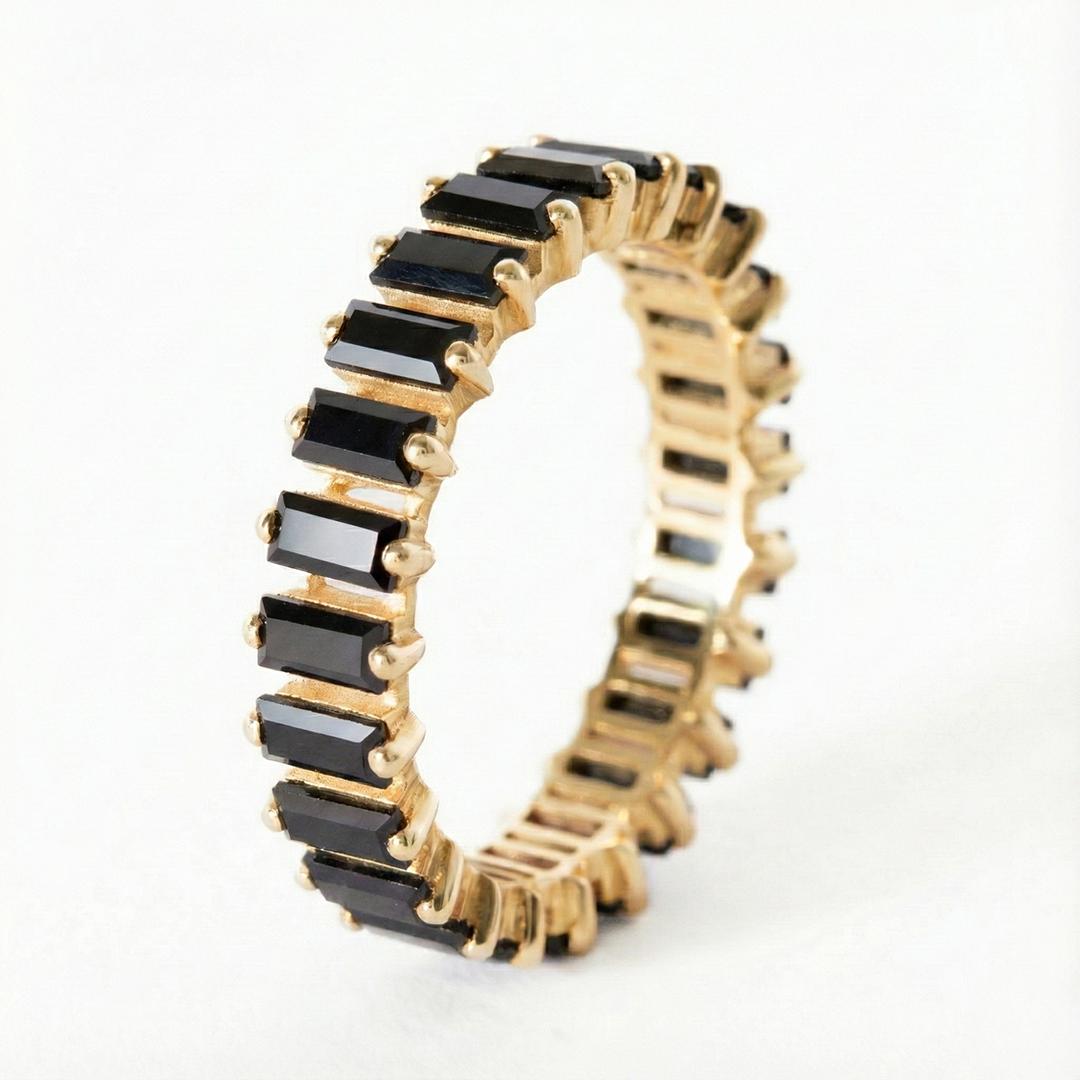 Eli is our vertical baguette eternity band: clean-lined, saturated, and bold. Wear it solo or layer it with color for your own mix.